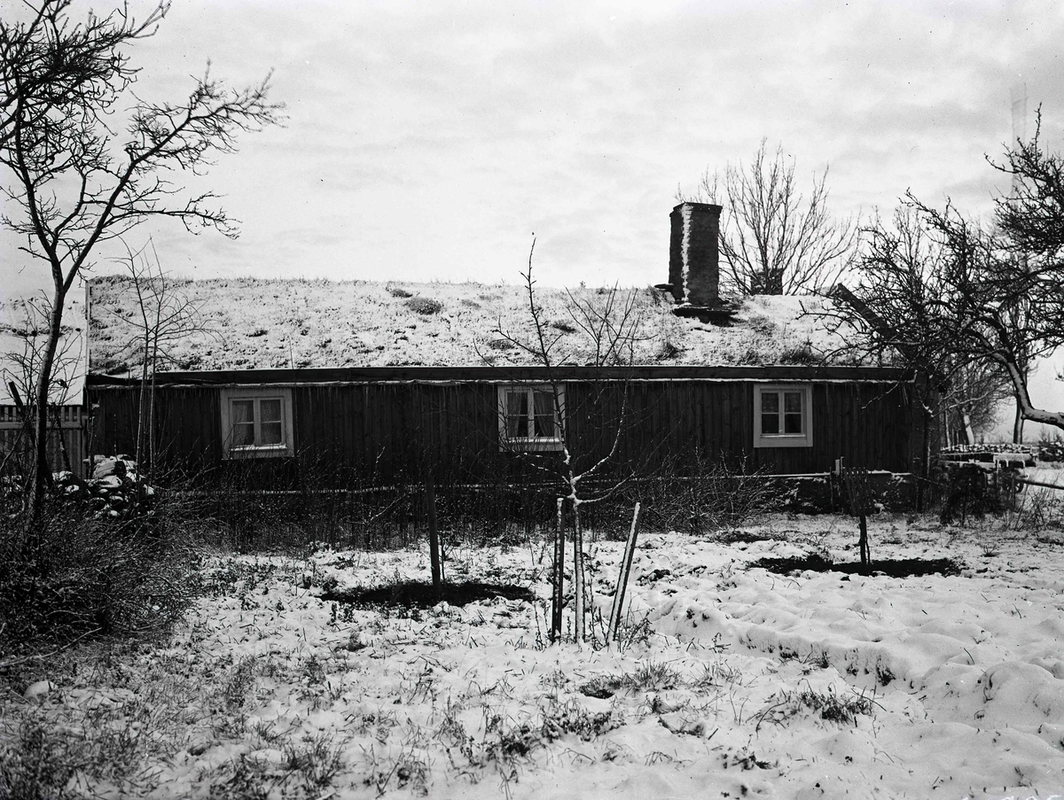 En stuga med torvtak i vintertid i Stenåsa.