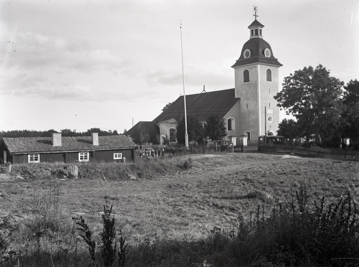 Musterhults kyrka med flaggstång och ryggåsstuga.
