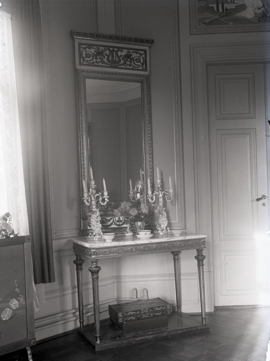 Spegelbord med ljusstake och spegel i herrgården i Fågelfors bruk.