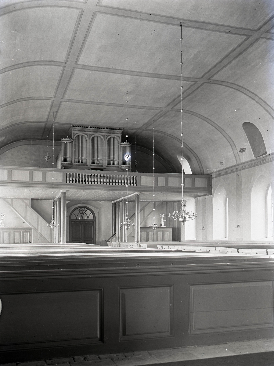 Kyrkbänkar och orgelläktare med balustrad i Åby kyrka.