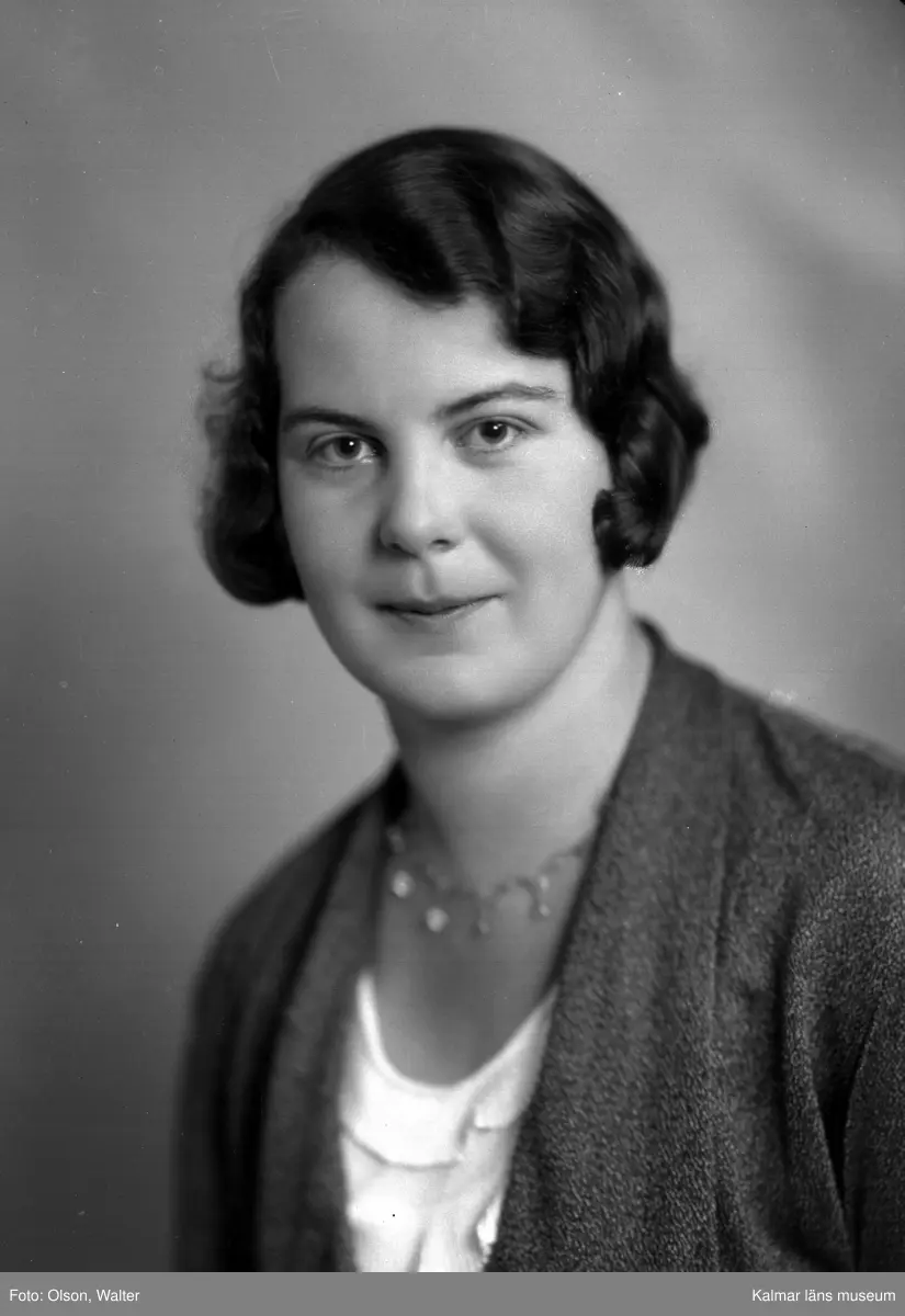Ateljébild på en kvinna i blus, jacka och ondulering. Enligt Walter Olsons journal är bilden beställd av Lisa Roos ifrån Storgatan 35 i Kalmar.