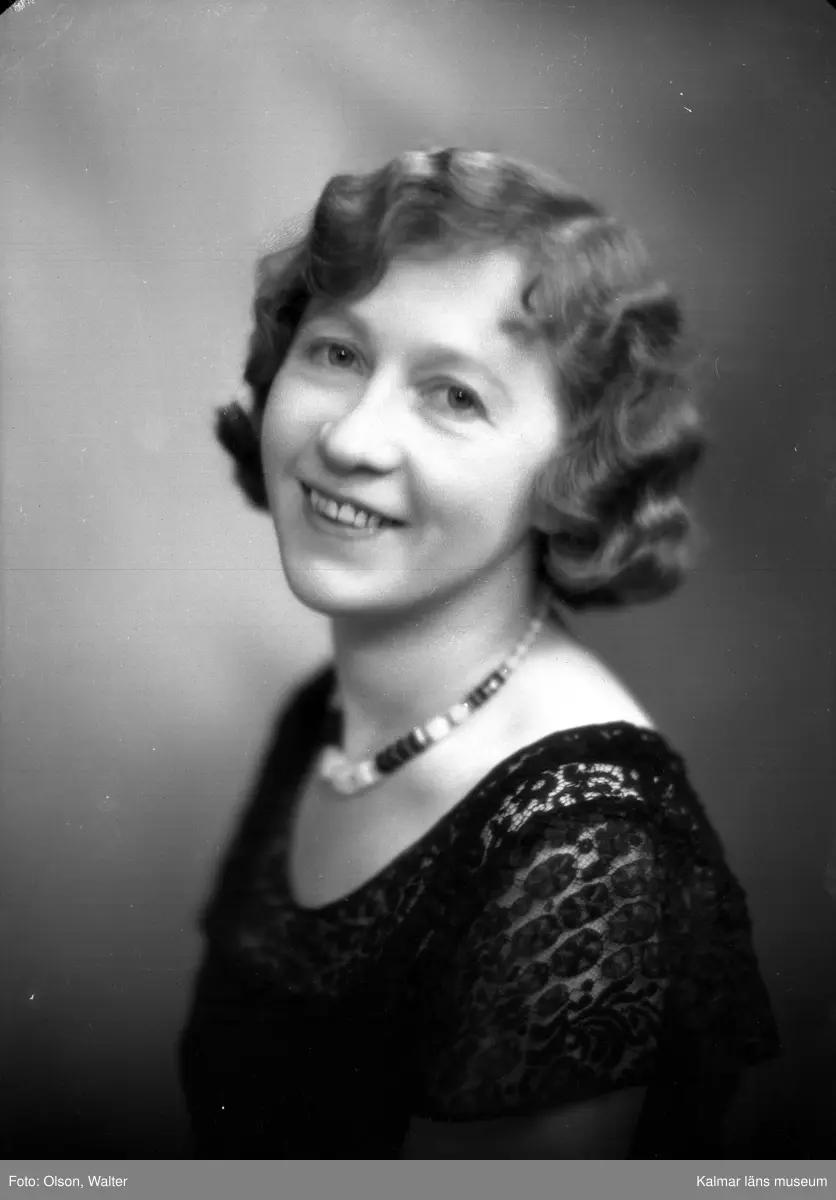 Ateljébild på en kvinna i halsband, klänning och ondulering. Enligt Walter Olsons journal är bilden beställd av Adéle Pettersson ifrån Gökalund.