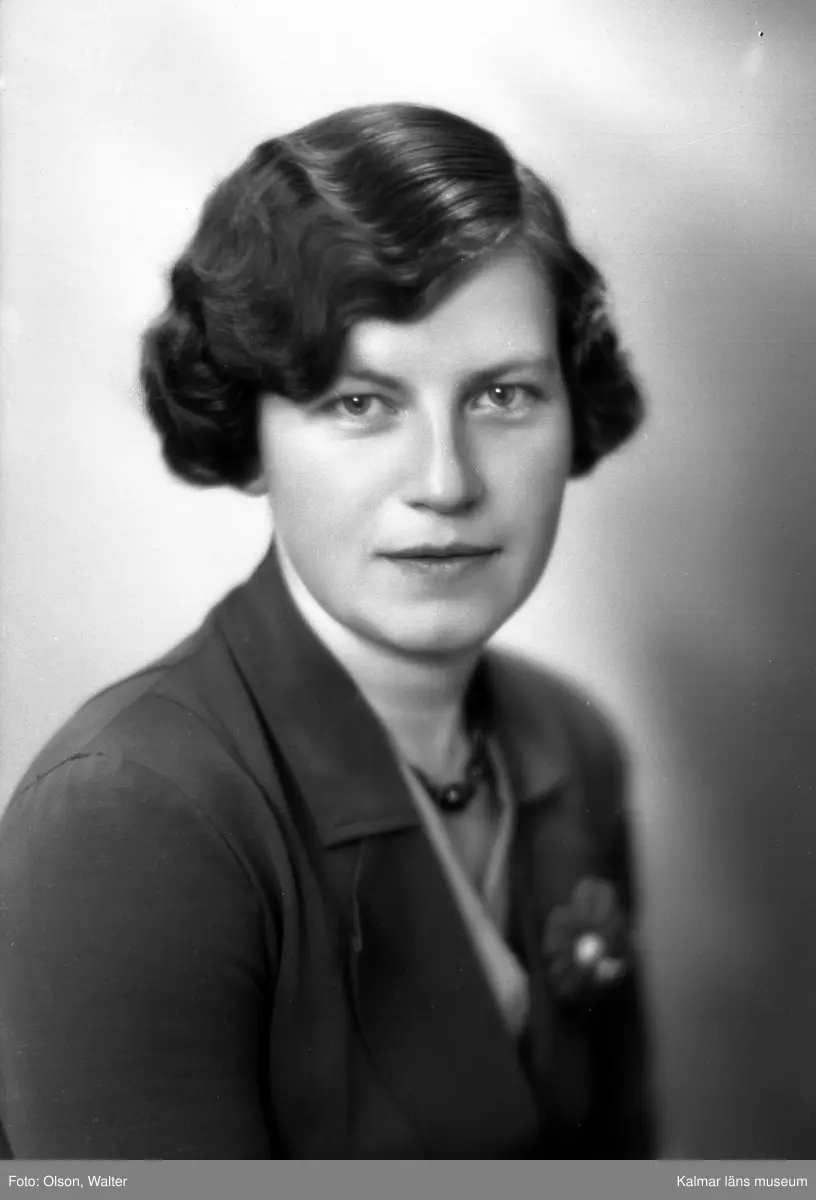 Ateljébild på en kvinna i blus, jacka och ondulering. Enligt Walter Olsons journal är bilden beställd av Alice Håkansson ifrån Norra vägen 56 i Kalmar.