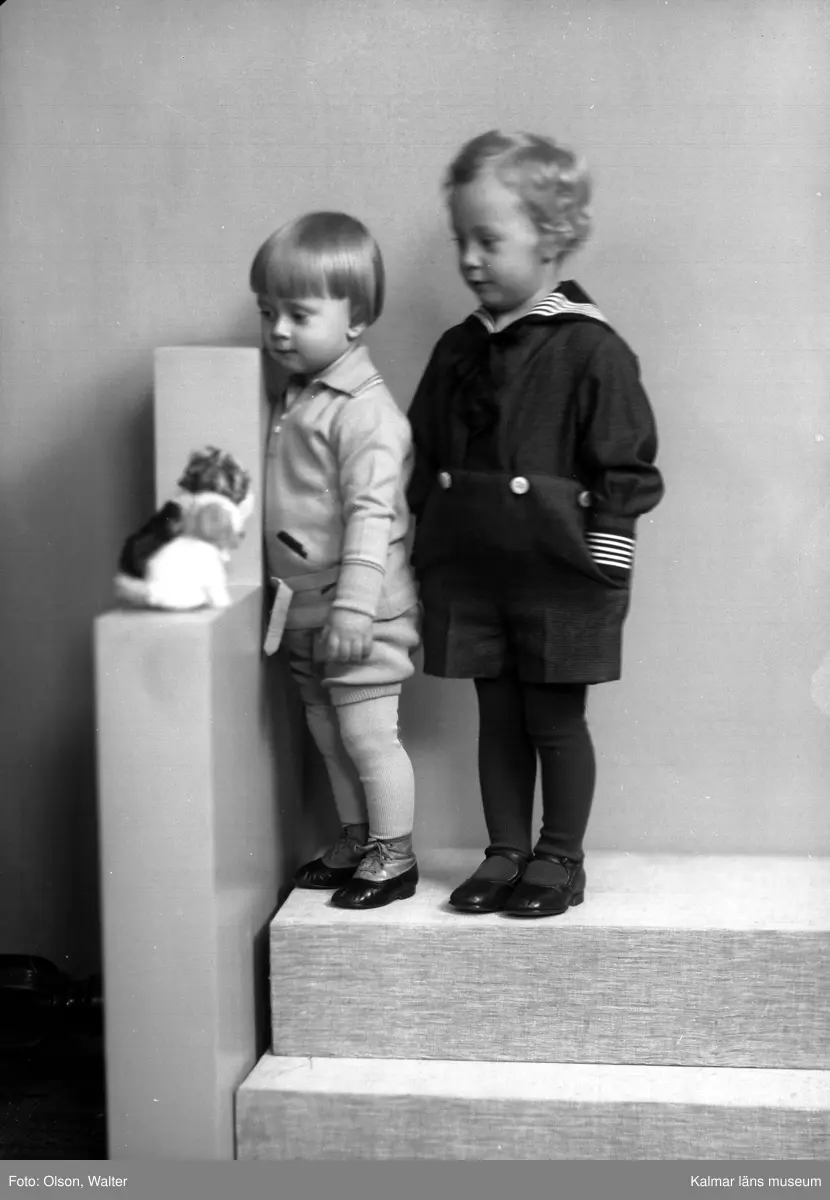 Två leksakshundar och två barn varav en har sjömanskostym. Enligt Walter Olsons journal är bilden beställd av fru A Elling ifrån Nybro.
