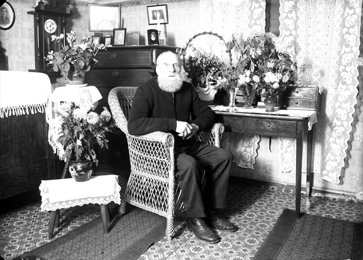 En hyllning till en man som sitter vid ett blomsterarrangemang. Enligt Walter Olsons journal är bilden beställd av C A Mogren ifrån Tullgatan 7 i Kalmar.