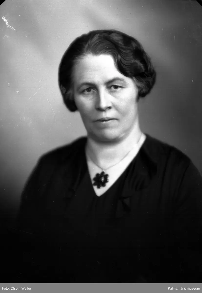 Ateljébild på en kvinna med halsband och hänge. Enligt Walter Olsons journal är bilden beställd av fröken Mina Ryd ifrån Hotellet i Mörbylånga.
