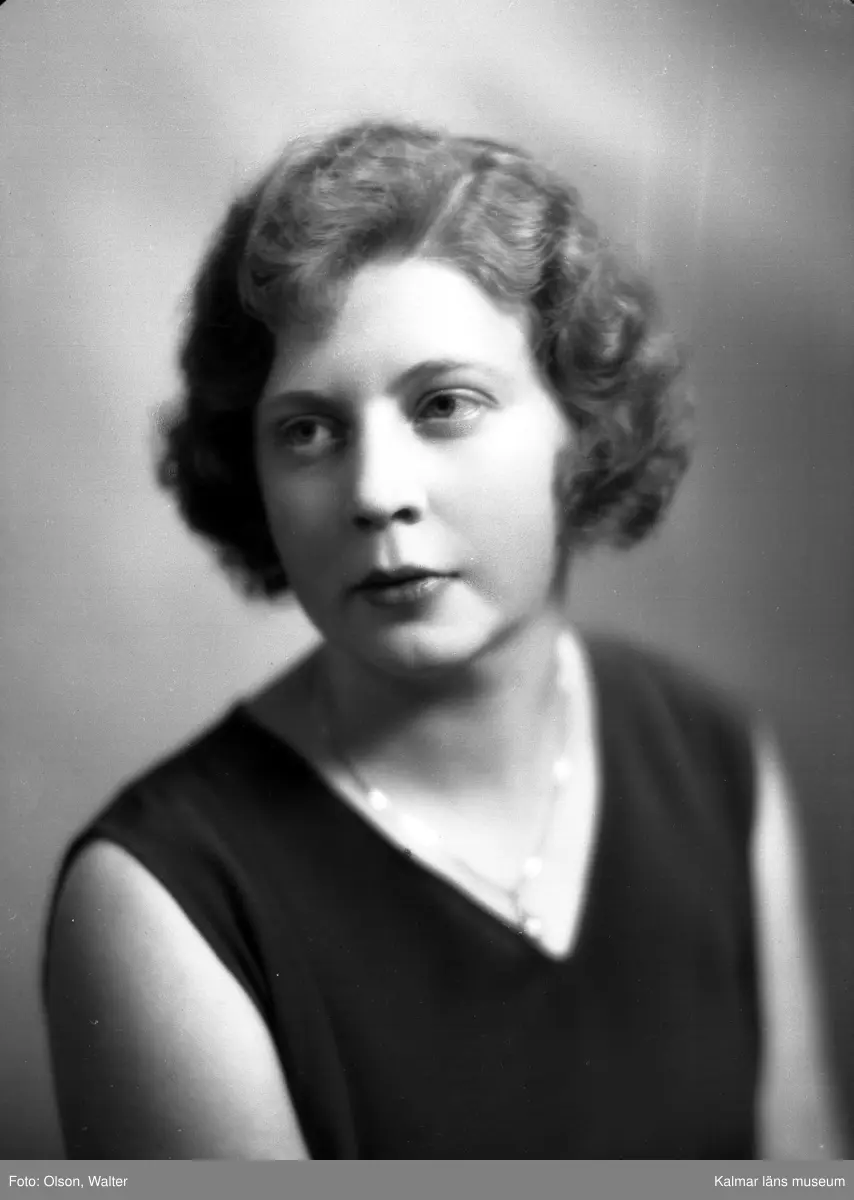 Ateljébild på en kvinna i klänning och halsband. Enligt Walter Olsons journal är bilden beställd av fröken Birgit Johansson ifrån Molinsgatan 2 i Kalmar.