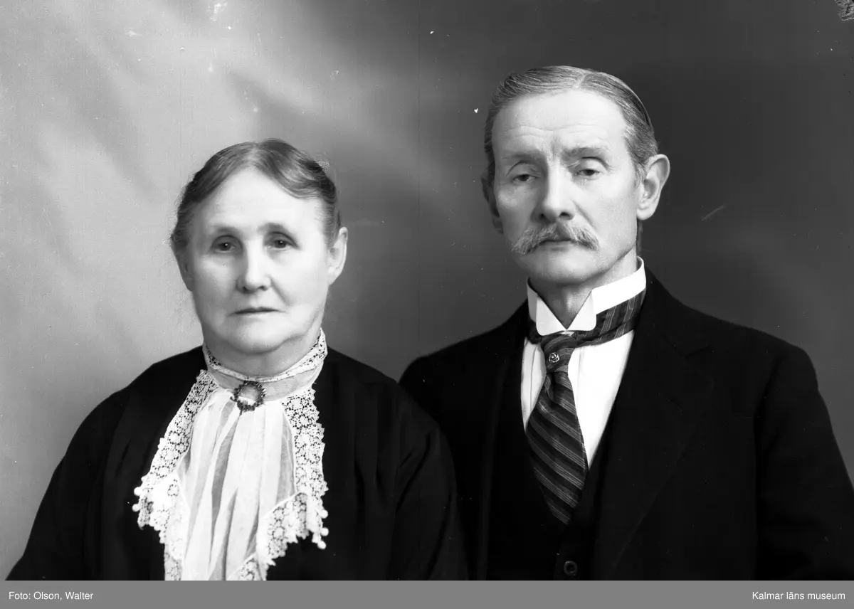 Ateljébild på en kvinna med brosch och krås. Mannen har stärkkrage. Enligt Walter Olsons journal är bilden beställd av herr C Th Johansson ifrån sparregatan 15 i Kalmar.