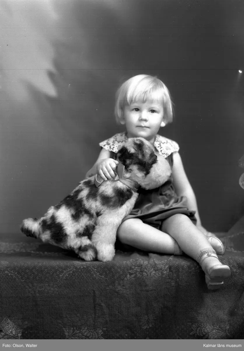 Ateljébild på en flicka med en leksakshund. Enligt Walter Olsons journal är bilden beställd av fru H Carlswärd ifrån Bremergatan 17 i Kalmar.