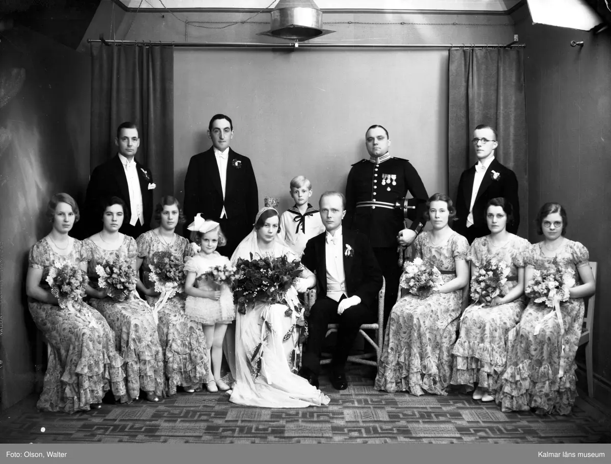 En bröllopsbild. Enligt Walter Olsons journal är bilden beställd av fotograf Staffan Kronberg ifrån Mäster Samuelsgatan 34 i Stockholm. Brudparet är Staffan Kronberg, son till konstnären Julius Kronberg, och Kerstin Margareta Olson, dotter till stadsarkitekt J Fred Olson i Kalmar.