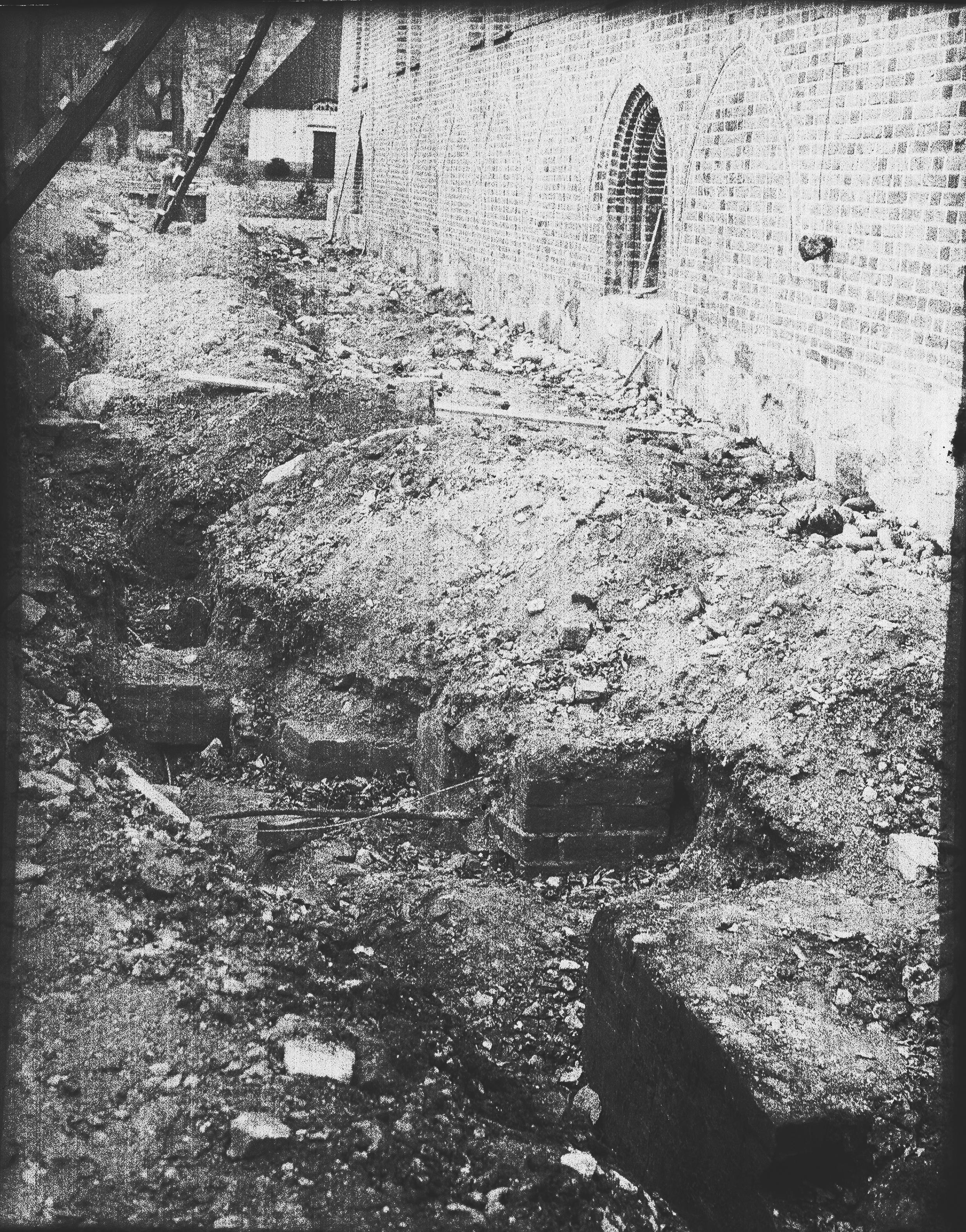 Mur mellan A-salen och östra korsgången. Dörröppning, östra hörnet mot korsgången. Från sydöst.