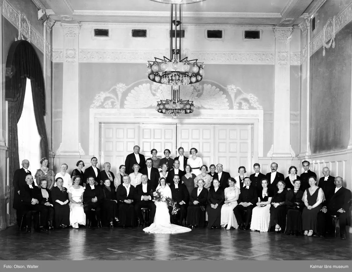 Bild vid en bröllopsfest med brudparet i mitten. Enligt Walter Olsons journal är bilden beställd av pastor Torsten Dahlberg ifrån Kastlösa.