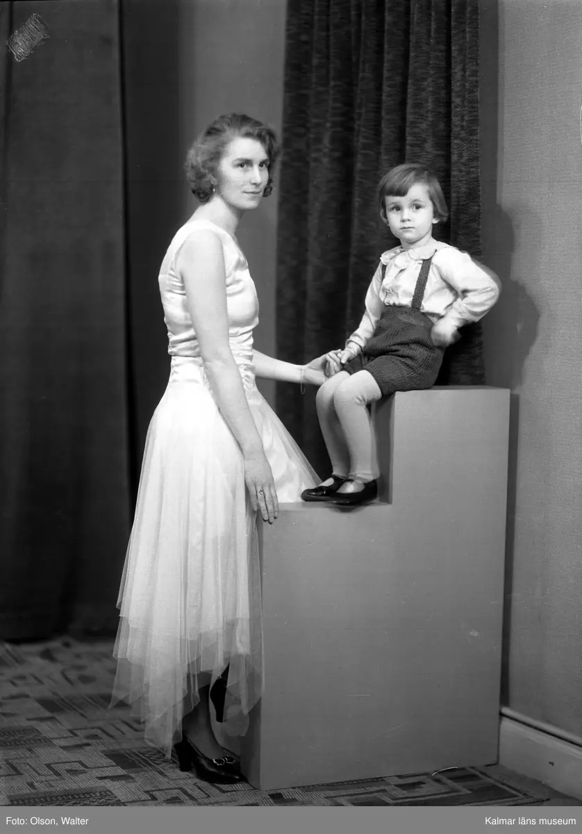 Ateljébild på kvinna och pojke. Enligt Walter Olsons journal är bilden beställd av fru Vera Nordström ifrån Germundsgatan 12 i Kalmar. Kalmar läns museum känner inte till om den personen är avbildad.