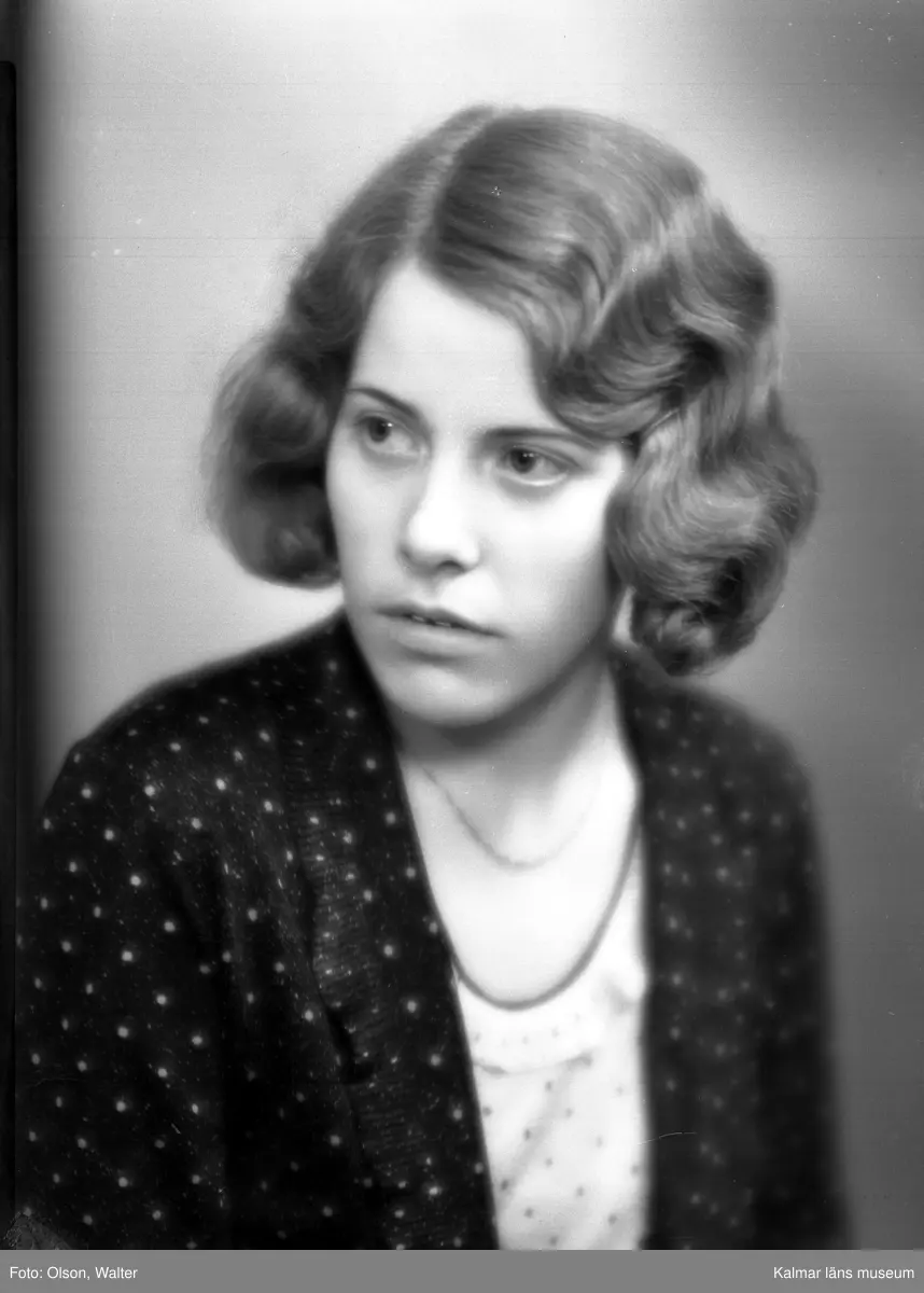 Ateljébild på en kvinna i blus, jacka och ondulering. Enligt Walter Olsons journal är bilden beställd av Greta Westein ifrån Storgatan 15 i Kalmar.