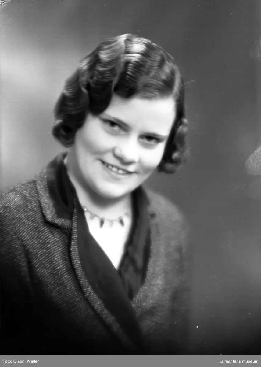 Ateljébild på en kvinna i blus, jacka och halsband. Enligt Walter Olsons journal är bilden beställd av Signe Frithiof ifrån Hotell Witt.