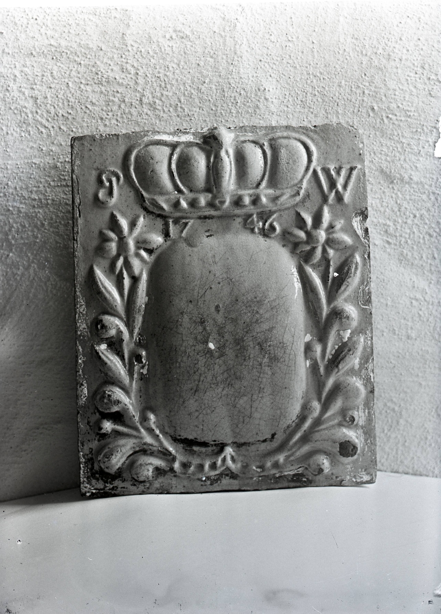 En glaserad kakelplatta med en tom sköld, under en kunglig krona.
