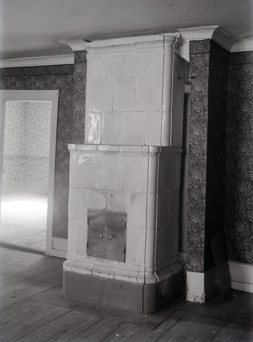 En kakelugn, i ett rum med blommiga tapeter, i ett anonymt hus.