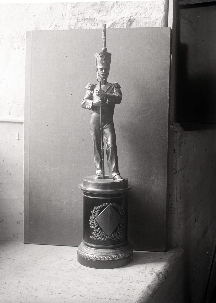 En statyett i metall, föreställande en husar.