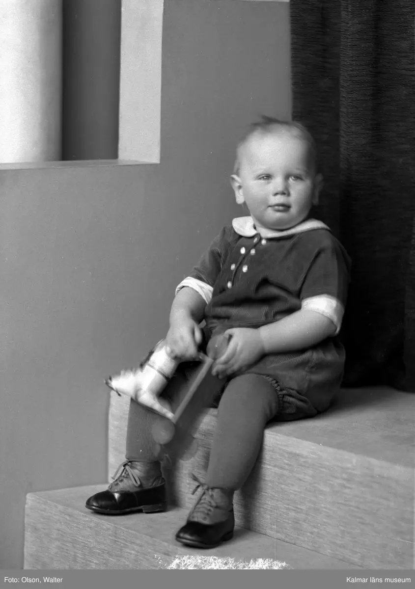 Ateljéfoto. Liten pojke med leksakshäst.
