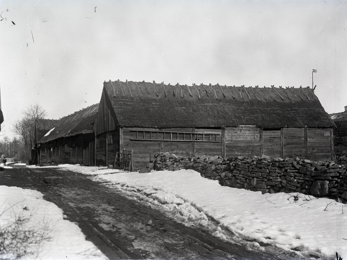 Ladugården vid gamla prästgården med stråtak och takryttare. Stenmur vid bygatan.