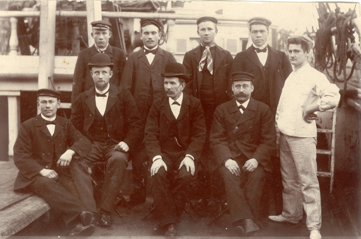 Kapten Johan Andersson, Timmernabben. Sittande i mitten, t.v. om honom styrman Erik Frazen, Pataholm.