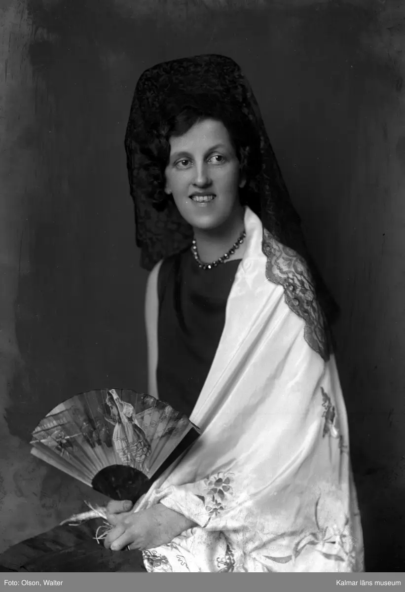 En ateljébild på en kvinna i slöja och med solfjäder. Enligt Walter Olsons journal är bilden beställd av fröken S Mannerskrantz ifrån Värnanäs.