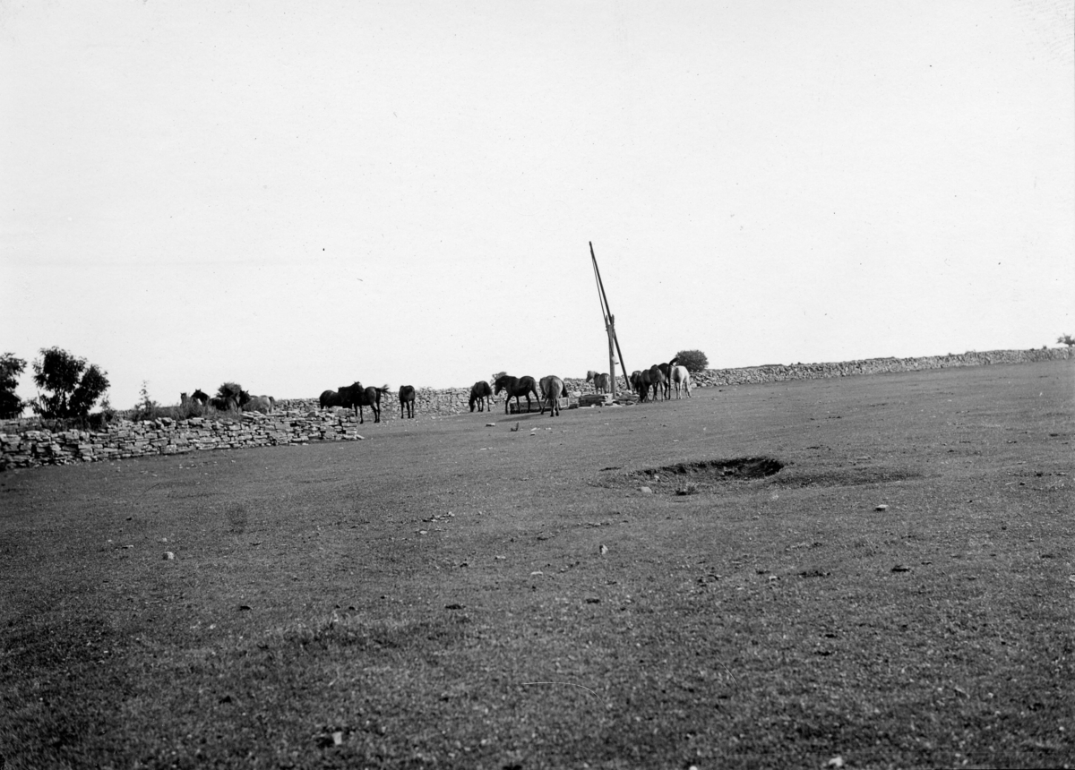 Hästar på sommarbete på det Öländska Alvaret, samlade vid vattenbrunnen.