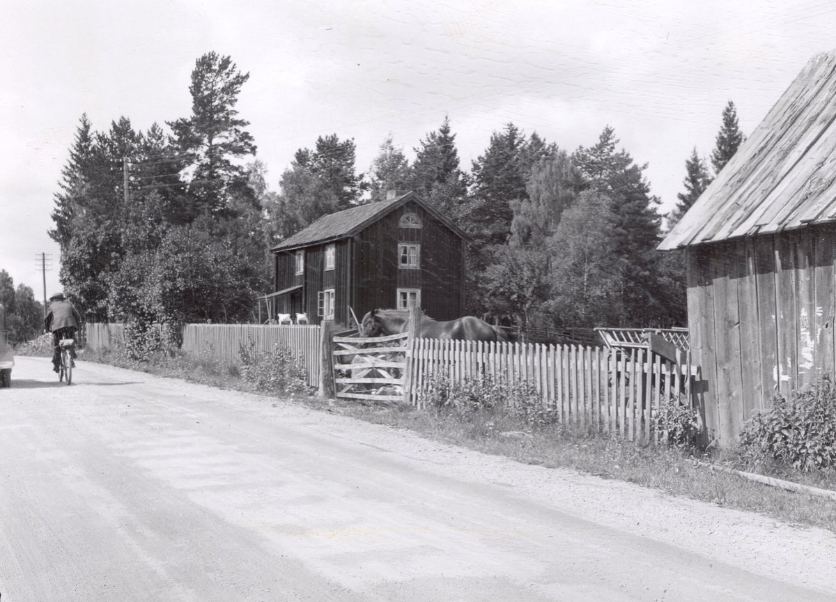 En bygata med mangårdsbyggnad, häst och lada i Madesjö.