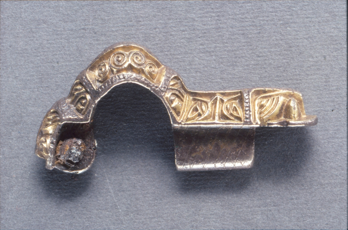 Massivt silver med förgyllning på båge och fot. Nålhållarens utsida dekorerad med ristat diagonalrutigt mönster. Funnen vid betplockning i Gråborg. Inköpt 1942 genom kandidat Bertil Almgren.