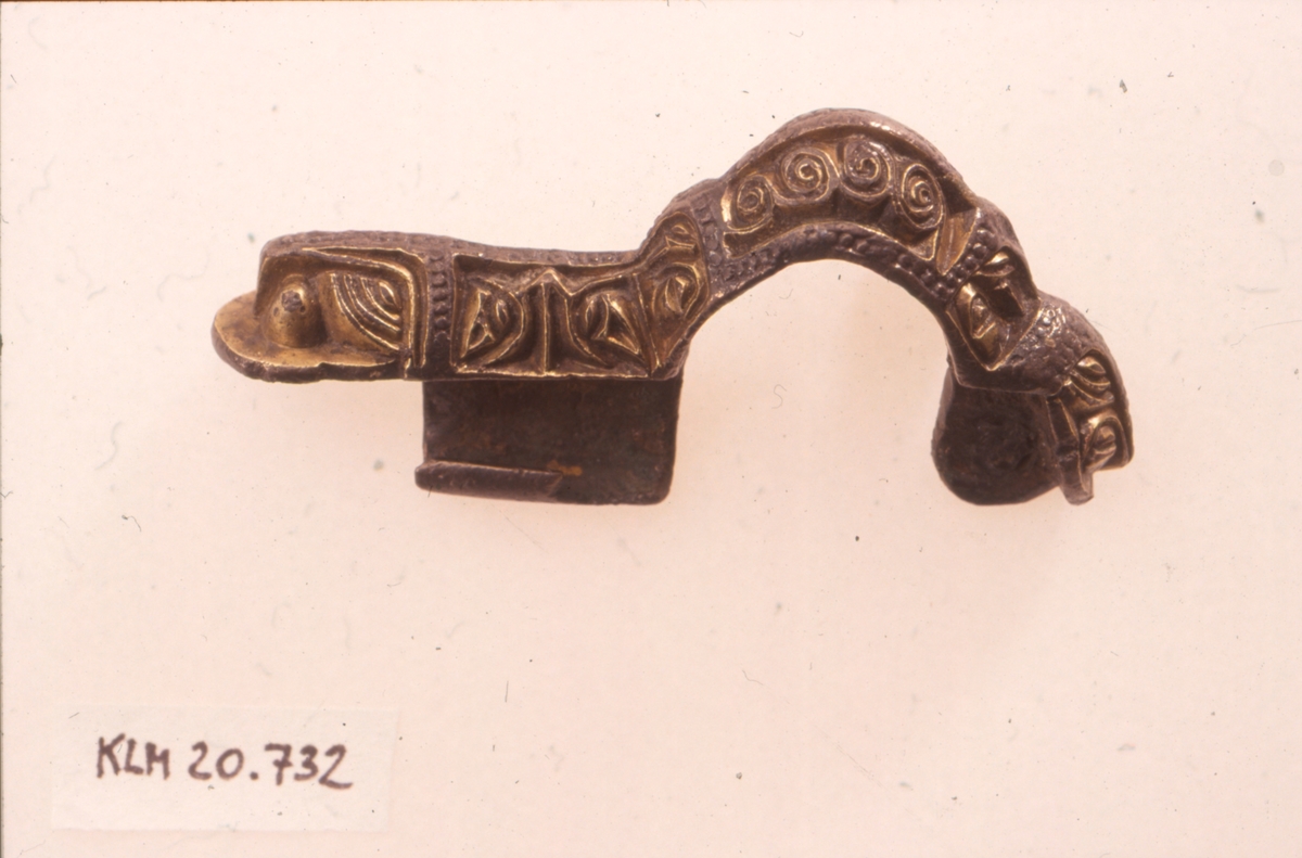 Massivt silver med förgyllning på båge och fot. Nålhållarens utsida dekorerad med ristat diagonalrutigt mönster. Funnen vid betplockning i Gråborg. Inköpt 1942 genom kandidat Bertil Almgren.