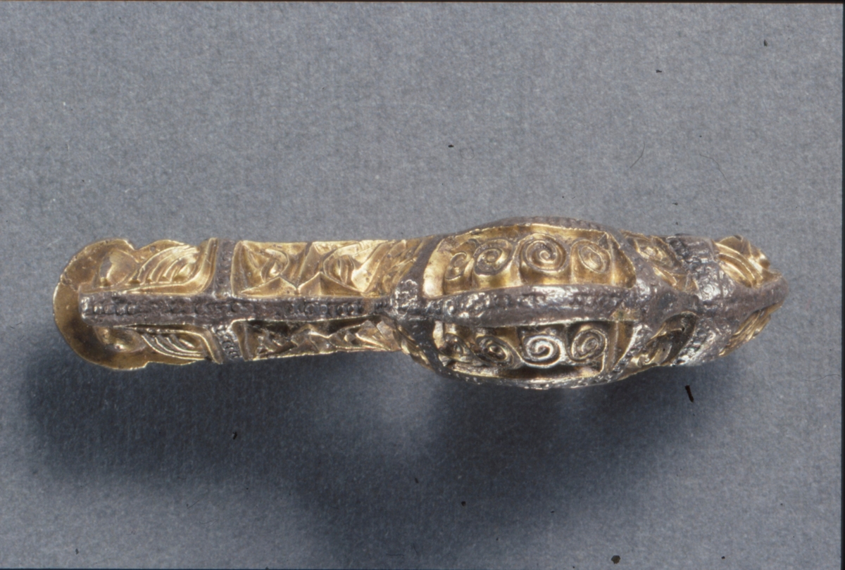 Massivt silver med förgyllning på båge och fot. Nålhållarens utsida dekorerad med ristat diagonalrutigt mönster. Funnen vid betplockning i Gråborg. Inköpt 1942 genom kandidat Bertil Almgren.