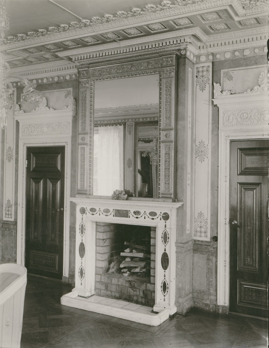 En salong med stuckatur och en öppen spis med en spegel. Bilden är tagen i en bruksherrgård i Överum.