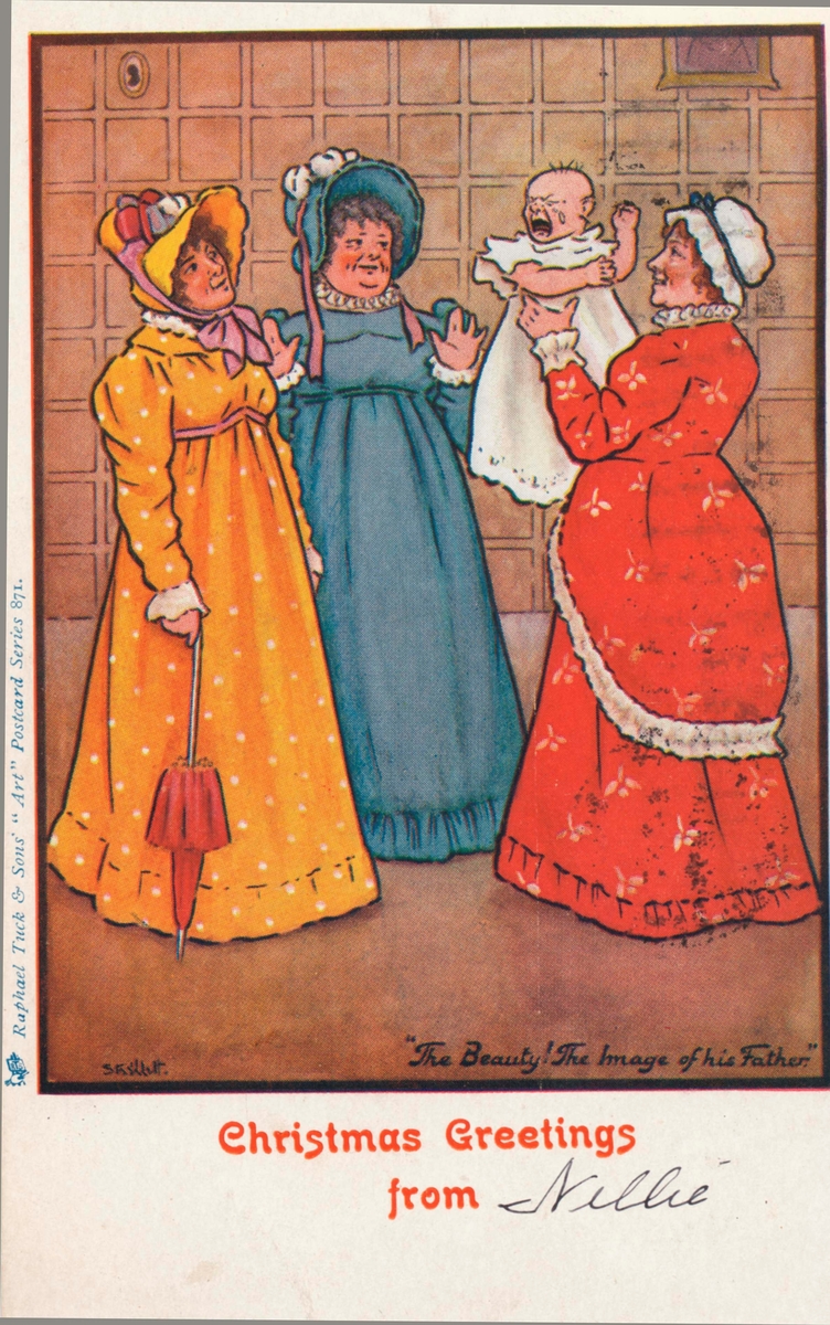 Vykort till Kristina Andersson, född 1865 i Böda, syster till N J Andersson, när hon bodde i USA från vänner i USA. Nedanför motivet står " Christmas Greetings from" (tryckt) Nellie.