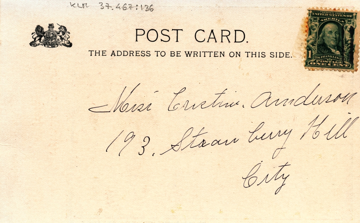 Ett vykort till Miss Cristin Anderson, 193, Strawberry Hill, City från Nellie.