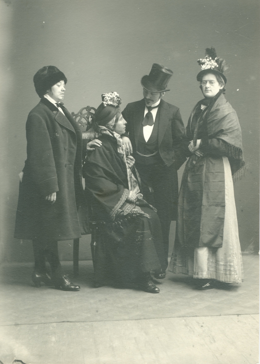 Grupporträtt på en man och tre kvinnor, Alva Winell sittande.