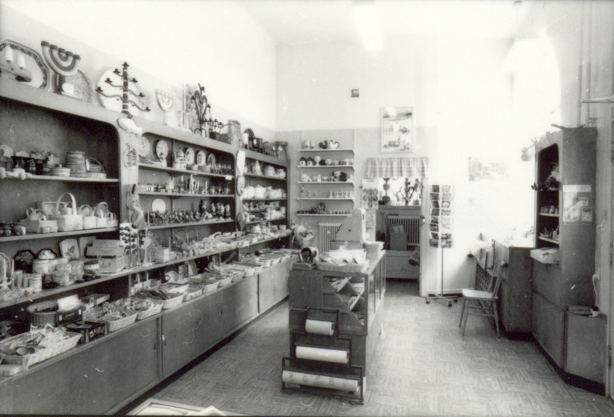 Teaterbutiken Calmus, interiör med kassa, hyllor med varor.