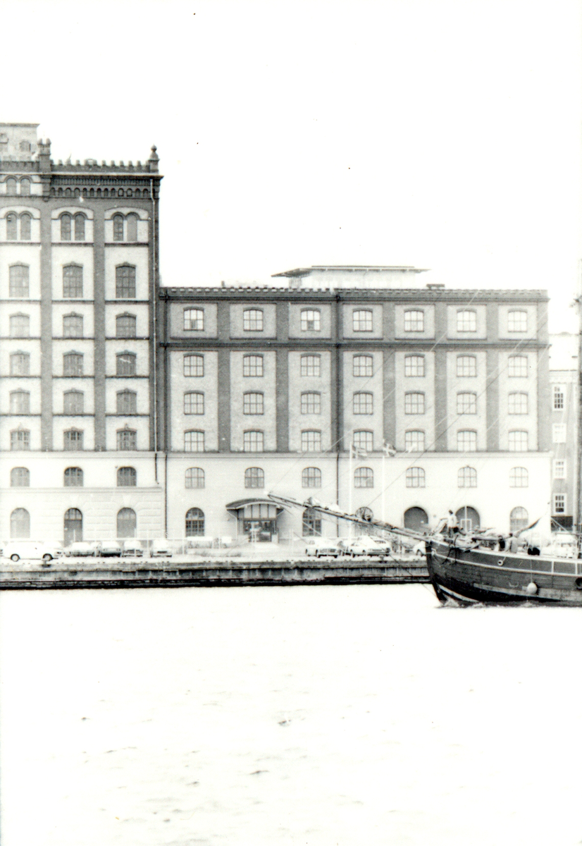 Ångkvarnen med fören av en segelbåt i förgrunden. Bilden är tagen från Finngrundet.