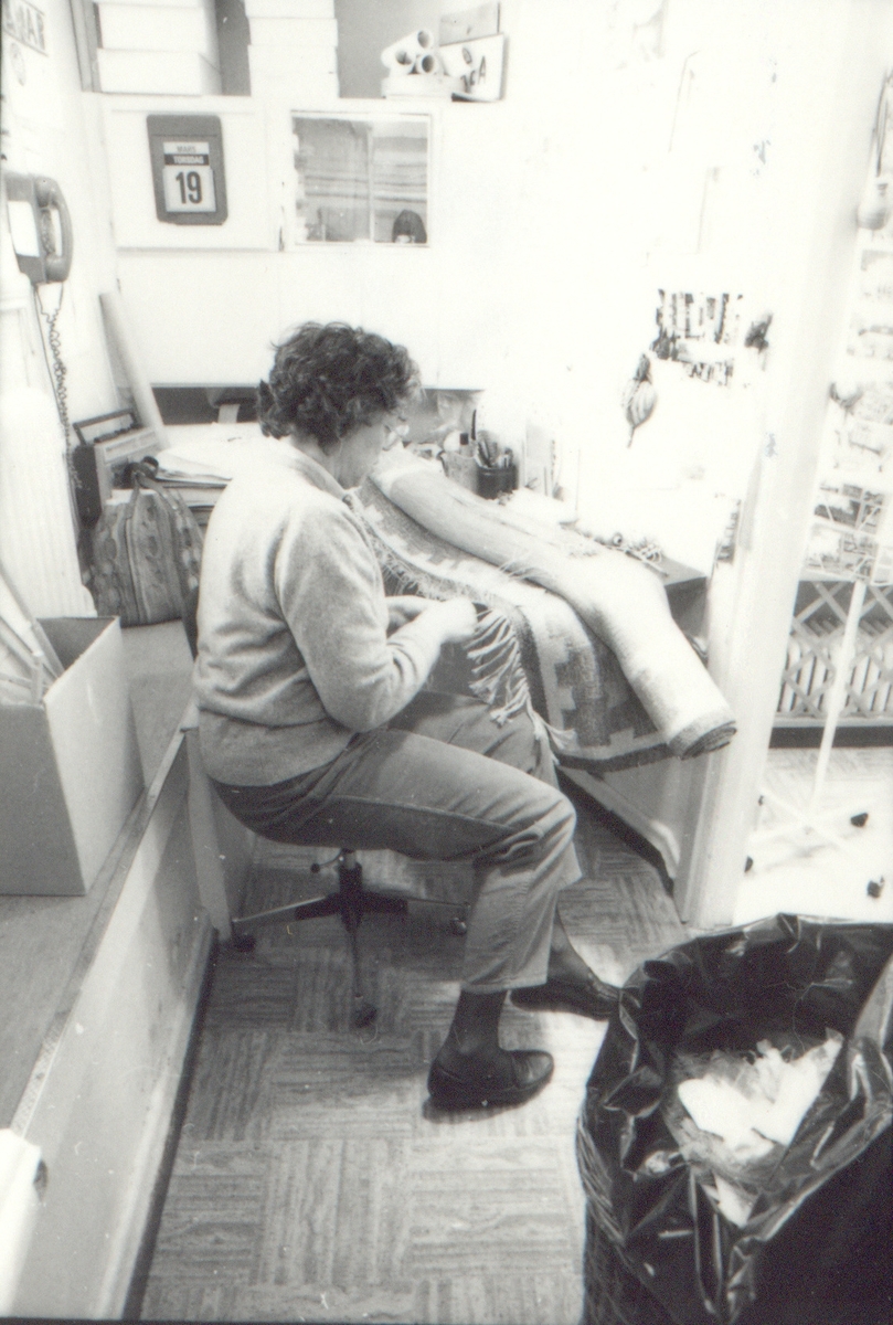 Interiör från museibutiken Calmus, en kvinna som arbetar med fransknytning.