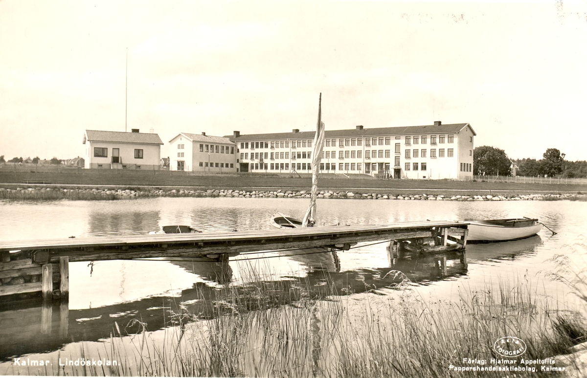 Lindöskolan i Kalmar omkring 1950. Den fristående villan var vaktmästarbostad.