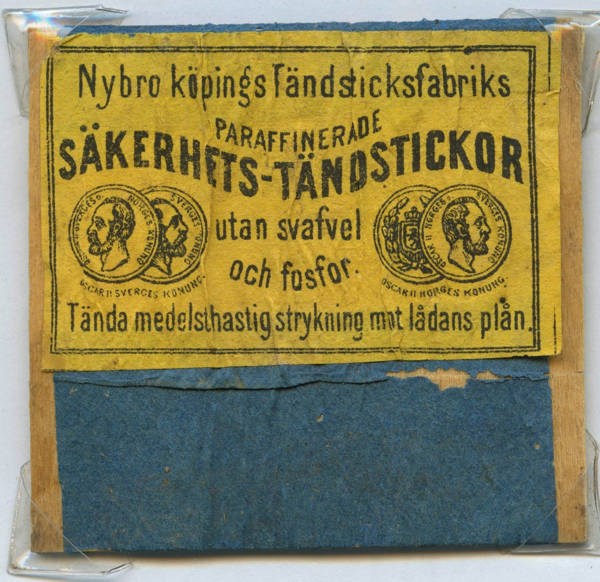 Tändsticksetikett från Nybro Tändsticksfabrik, "Nybro Köpings Tändsticksfabriks säkerhetständstickor"