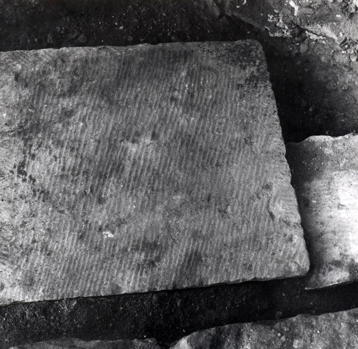 Utgrävning på Kalmar slott. Detalj av kalkstensplattorna. Rapporten: Krutkammaren, vallgraven, västra vallen och brunnar.