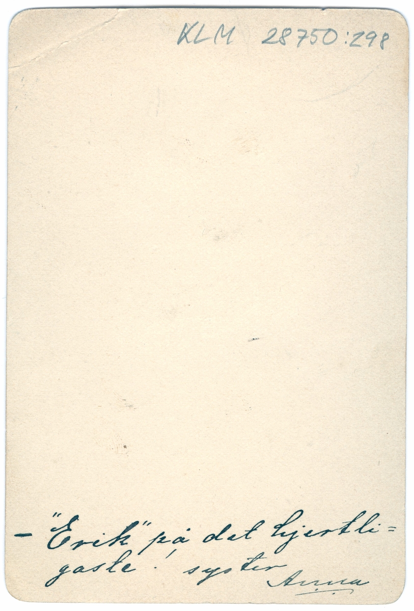Baksida på gratulationskort, "Erik" på det hjärtligaste! syster Anna.