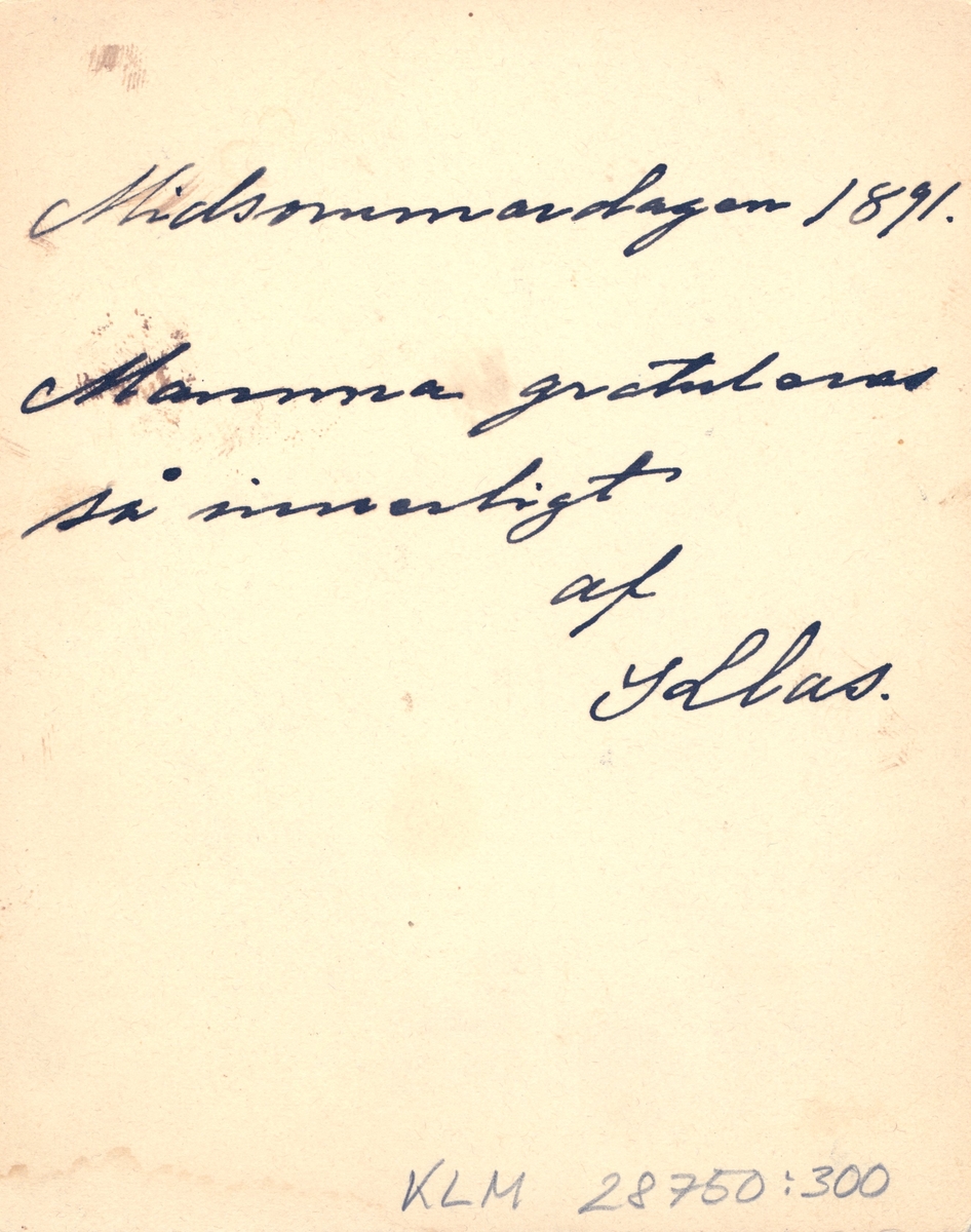 Baksidan på ett gratulationskort, midsommardagen 1891.