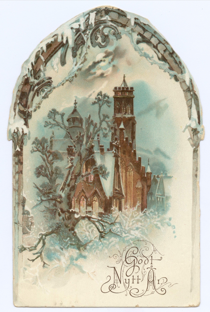 Nyårskort med texten. Godt, på det nya året, önskas varmt far,mor och syskon av Wilhelm och Hulda.