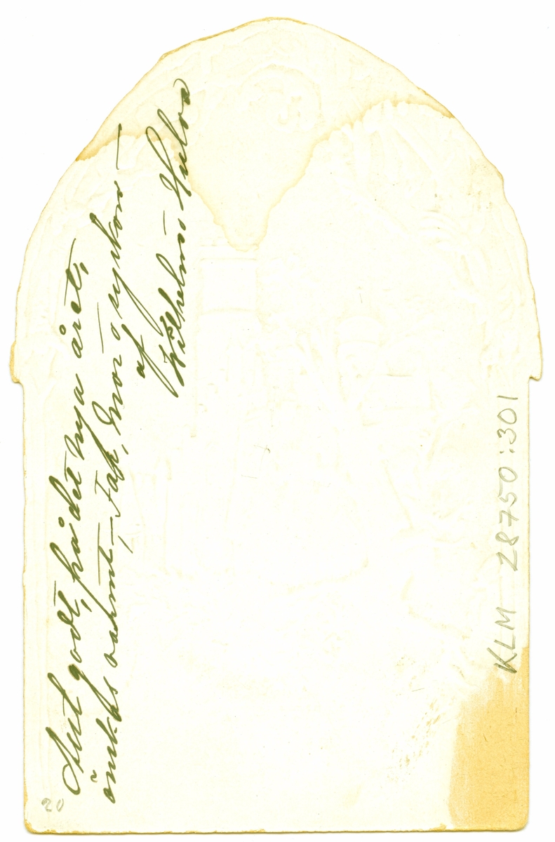 Baksida på nyårskort med texten. Allt godt, på det nya året, önskas varmt far,mor och syskon av Wilhelm och Hulda.