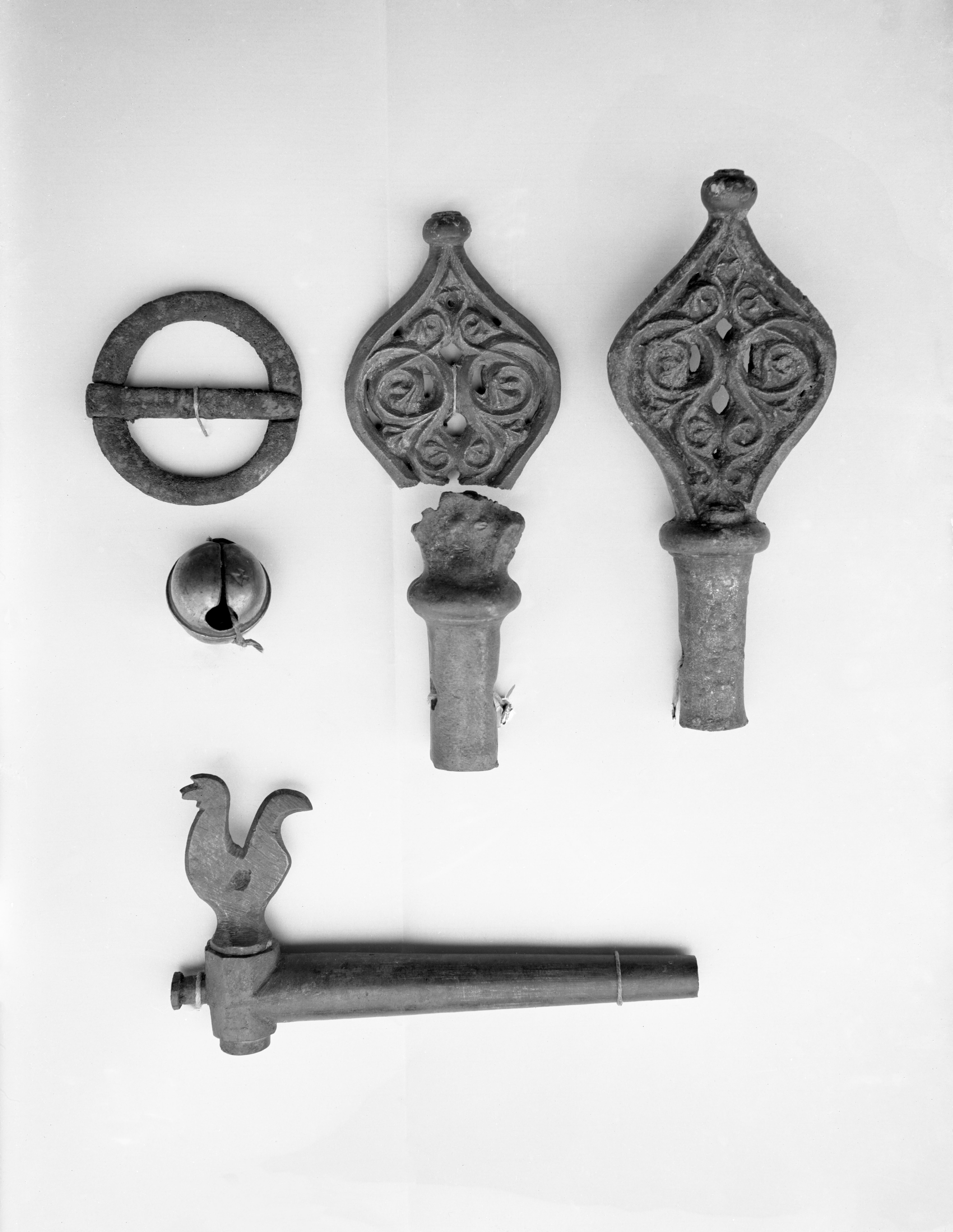 Fynd av brons. Bland annat två ornerade krantappar funna i klostrets lavabo. Foto från omkring 1927.