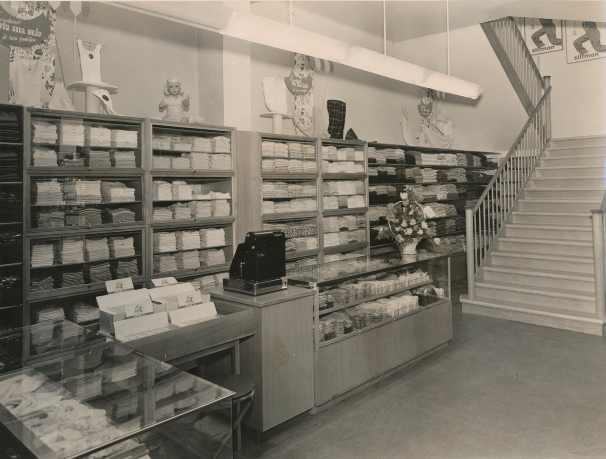 Interiör från klädavdelningen på Domus [hörnet Södra Långgatan/Kaggensgatan], på 1950-talet.