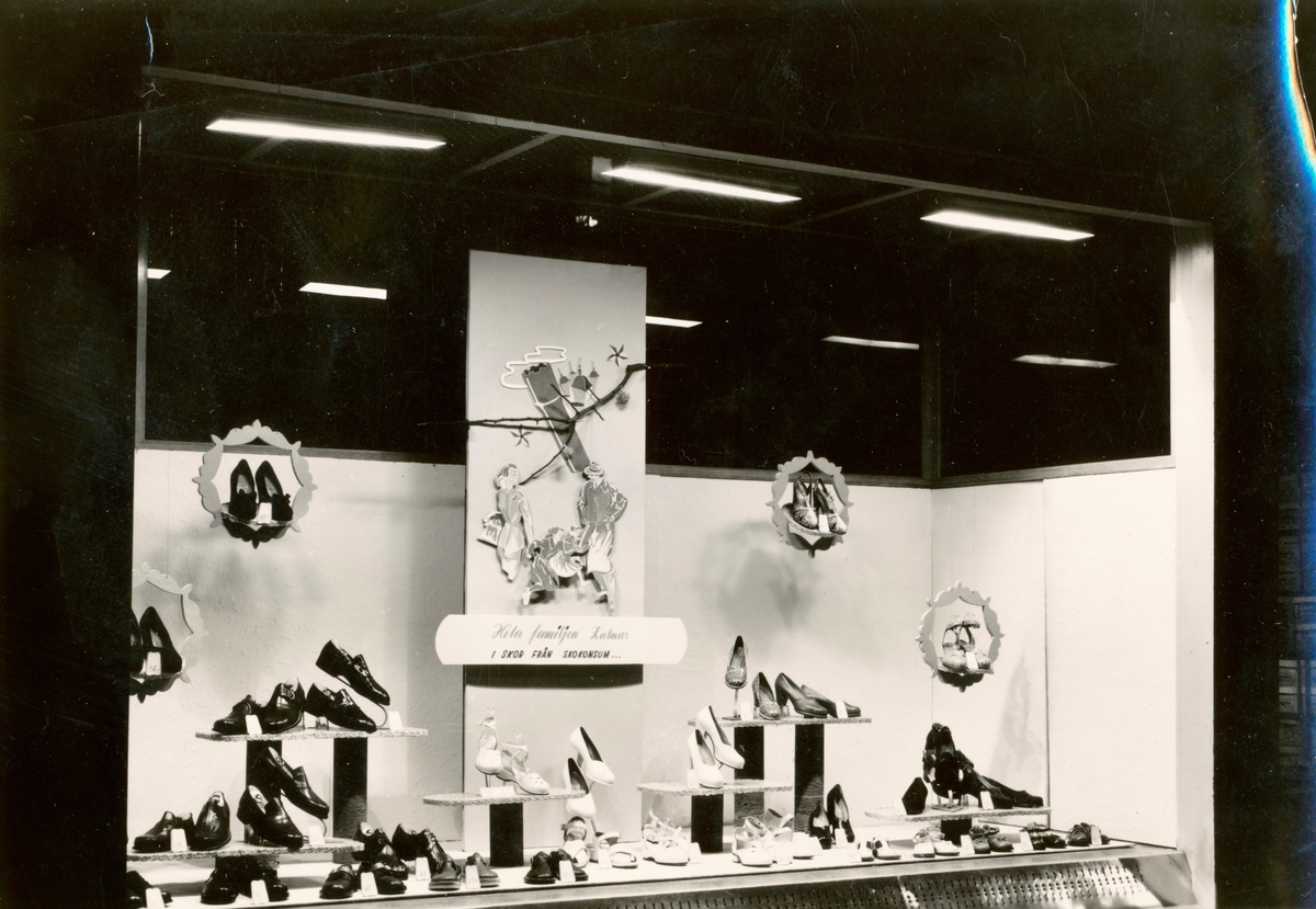 Skyltfönster i Domus [hörnet Södra Långgatan/Kaggensgatan] med reklam för Sko-Konsum, på 1950-talet.
