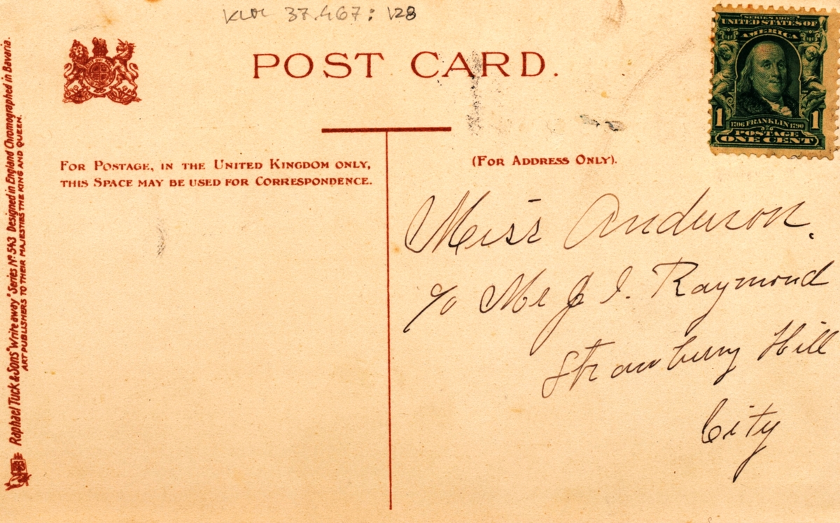 Ett vykort till Miss Anderson c/o Mr Raymond Strawberry Hill City.