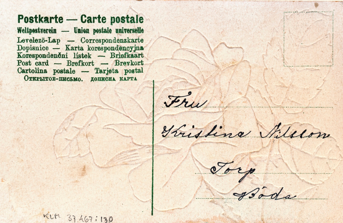 Ett gratulationskort till fru Kristina Nilsson, Torp, Böda från Hildur.